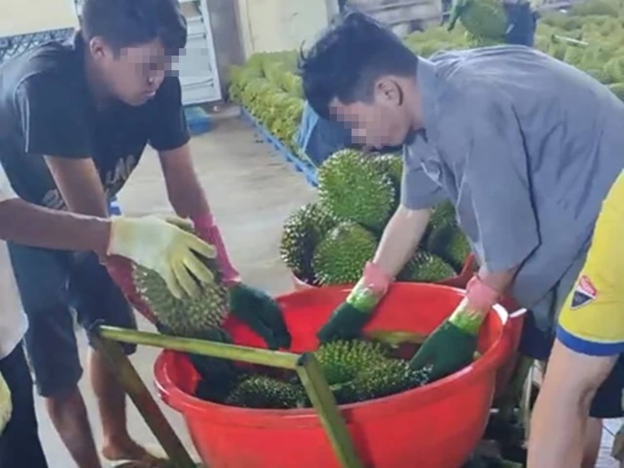 Công nhân ngâm, nhúng sầu riêng vào thau hóa chất không rõ nguồn gốc. (Ảnh: congan.daklak.gov.vn)
