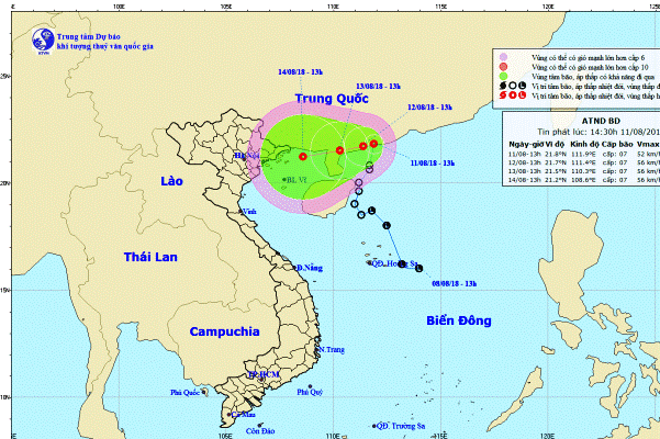 Theo Trung tâm Dự báo Khí tượng Thủy văn Trung ương, hồi 13h ngày 11/8, vị trí tâm áp thấp nhiệt đới ở vào khoảng 21,8 độ Vĩ Bắc; 111,9 độ Kinh Đông, ngay trên vùng bờ biển phía Nam tỉnh Quảng Đông (Trung Quốc). Sức gió mạnh nhất vùng gần tâm áp thấp nhiệt đới mạnh cấp 6-7 (40-60km/giờ), giật cấp 8. Phạm vi gió mạnh cấp 6, giật cấp 8 khoảng 50km tính từ tâm áp thấp nhiệt đới.