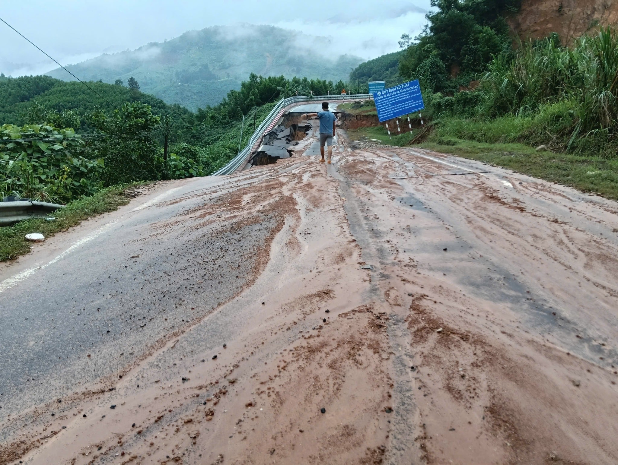 Còn 3 vị trí sạt taluy âm gây đứt, sụp mặt đường, đơn vị bảo trì thông tuyến 1/2 mặt đường, phần còn lại cùng địa phương rào chắn, chốt chặn không cho xe qua lại.