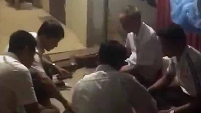 Tại đây, họ thấy nhóm dân quân và bảo vệ đang ngồi đánh bài để ăn cháo đêm nên cùng vào tham gia một lúc. Khi đang đánh bài thì có một người dân vào quay clip.