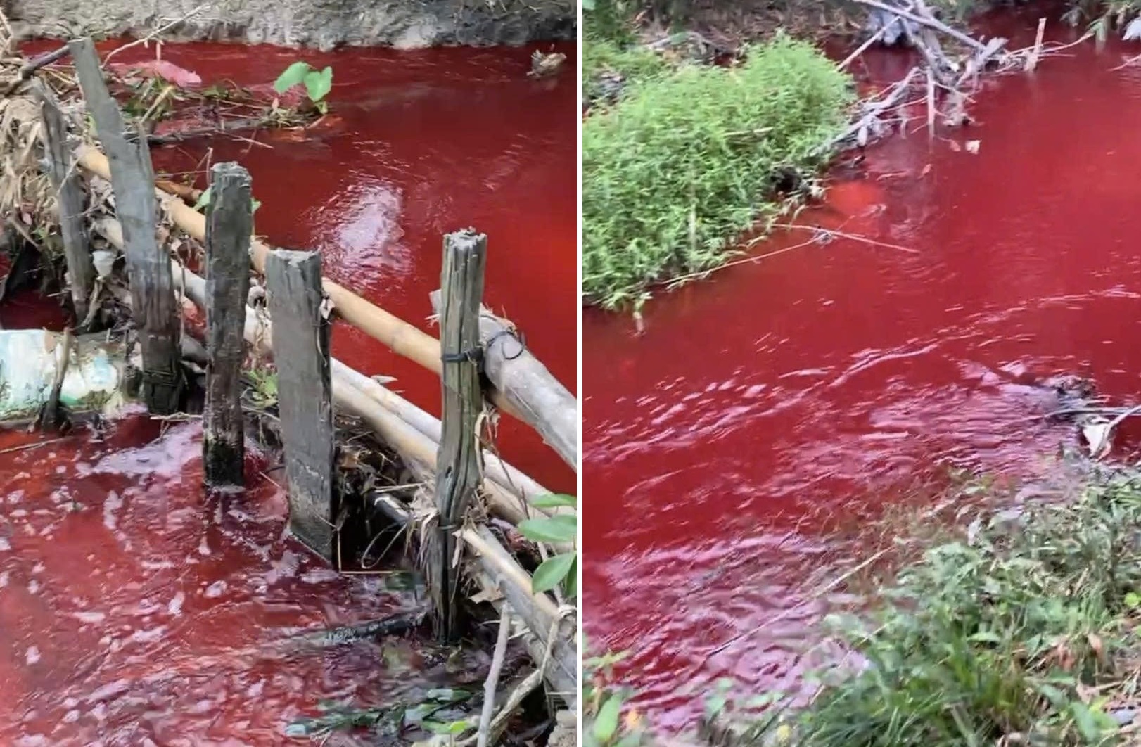 “Xả xuống suối, bao nhiêu khu công nghiệp cứ đè suối mà xả không” – người quay video nói, “hết phân heo tới nước thải”. Người này cho hay lúc quay không thấy có mùi lạ, nhưng toàn bộ dòng suối đều chuyển sang màu đỏ, sợ cá tôm chết hết.