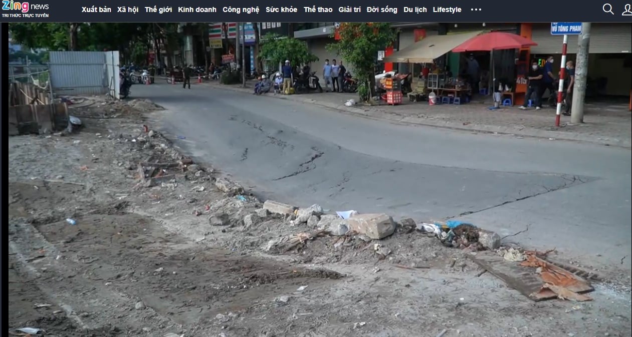 Khoảng 23 m đường Vũ Tông Phan bị sụt lún, khu vực thi công giếng khoan kích ngầm 11.1 bị sụt lún, biến dạng mặt đường. (Ảnh chụp màn hình/video/Zing News)