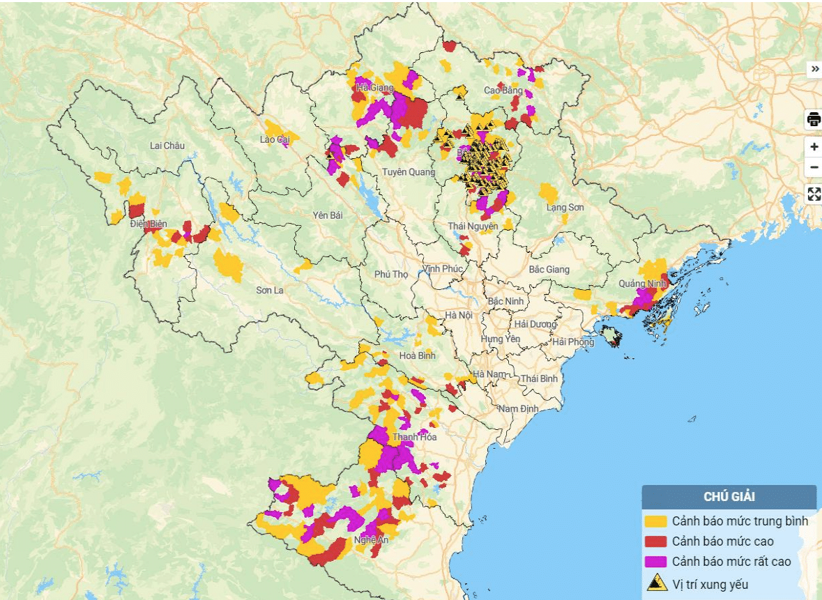 Các chuyên gia cảnh báo nguy cơ xảy ra lũ quét trên các sông, suối nhỏ, sạt lở đất trên sườn dốc tại nhiều khu vực. Cảnh báo độ rủi ro thiên tai do lũ quét, sạt lở đất, sụt lún đất do mưa lũ hoặc dòng chảy cấp 1.