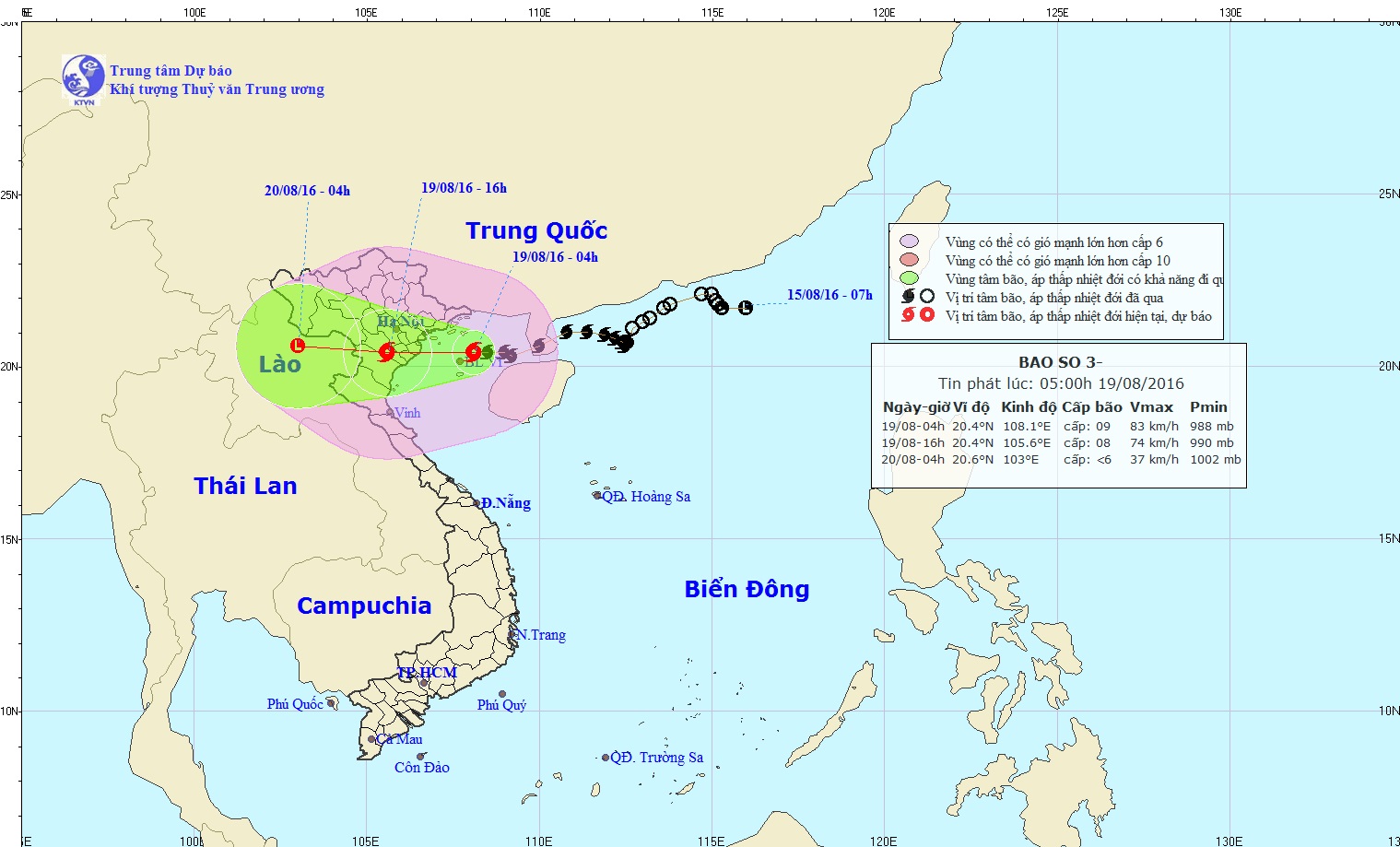 Đến 16h ngày 19/8, vị trí tâm bão ở vào khoảng 20,4 độ vĩ Bắc; 105,6 độ kinh Đông, trên đất liền các tỉnh đồng bằng Bắc Bộ và phía Bắc Thanh Hóa. Sức gió mạnh nhất ở vùng gần tâm bão mạnh cấp 8 (60-75 km/giờ), giật cấp 10-12.