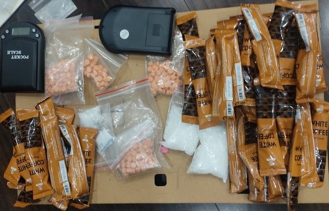Tang vật bị thu giữ gồm: gần 200 gam ma túy loại hàng khay ketamine, 317 viên thuốc lắc, 39 gói ma túy (tổng trọng lượng gần 1kg) ngụy trang dưới dạng gói cà phê, cùng một số vật chứng liên quan.