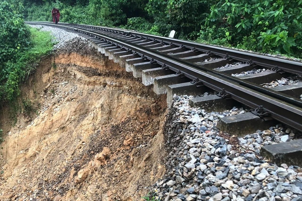 Mưa lớn kéo dài đã gây sạt lở trên tuyến đường sắt Bắc – Nam đoạn qua Hà Tĩnh khiến nhiều chuyến tàu không thể lưu thông qua lại.
