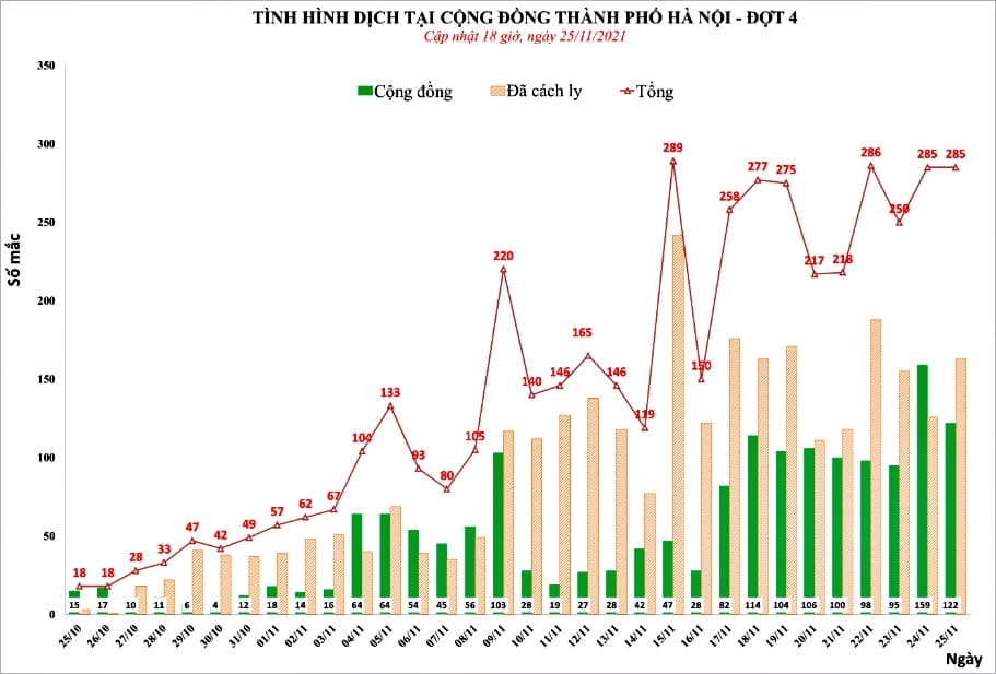 Tại Công điện số 25/CĐ-UBND do Chủ tịch UBND TP Hà Nội – ông Chu Ngọc Anh ký chiều 26/11, chính quyền TP cho hay từ ngày 11/10 đến ngày 25/11, Hà Nội ghi nhận 4.817 ca mắc COVID-19, trong đó số ca cộng đồng tăng nhanh với 1.704 ca (chiếm 35,43%), đồng thời số ca lây nhiễm thứ phát cũng tăng lên.