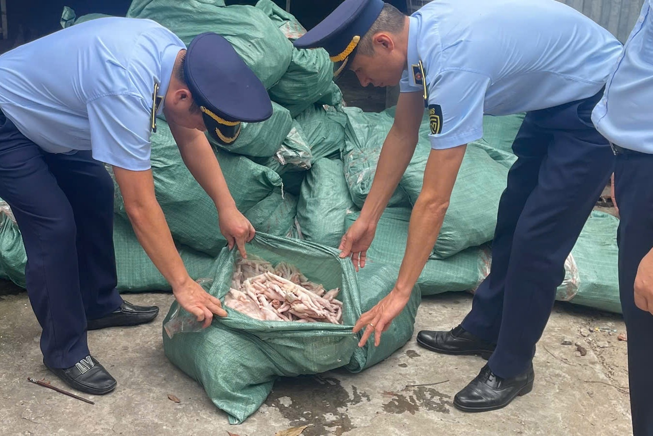 Một năm trước, tháng 6/2024, Đội Quản lý thị trường số 4 (Chi cục Quản lý thị trường tỉnh Quảng Ninh) phát hiện thùng container do xe đầu kéo do ông Trần Trung Thế (SN 1987, thường trú phường Ninh Dương TP. Móng Cái) điều khiển vận chuyển 2.220 thùng carton (loại 11 kg/thùng), chứa tổng cộng gần 25 tấn chân gà đông lạnh. Các thùng carton có nhãn gốc bằng chữ nước ngoài, không thể hiện thông tin nguồn gốc, xuất xứ, không có nhãn phụ bằng tiếng Việt Nam.