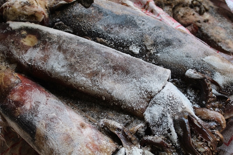 Tại thời điểm kiểm tra, 34 bao tải màu trắng in chữ Trung Quốc chứa tổng cộng 646kg mực ống đông lạnh. Toàn bộ số mực ống đông lạnh này đã có dấu hiệu mốc, chảy nước, bốc mùi hôi thối.