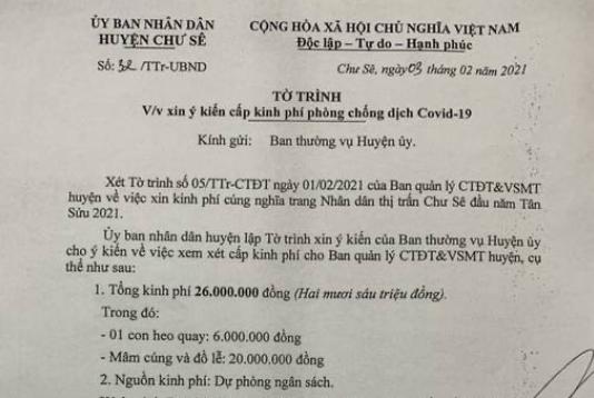 Sau đó, UBND huyện Chư Sê có tờ trình số 32 gửi Ban thường vụ Huyện ủy Chư Sê với tiêu đề “Xin ý kiến cấp kinh phí phòng chống dịch COVID-19”, nhưng ở nội dung lại là: “Bổ sung ngân sách huyện năm 2021 cho Ban quản lý công trình đô thị và vệ sinh môi trường huyện Chư Sê” số tiền 26 triệu đồng để cúng nghĩa trang nhân dân thị trấn Chư Sê đầu năm Tân Sửu 2021.