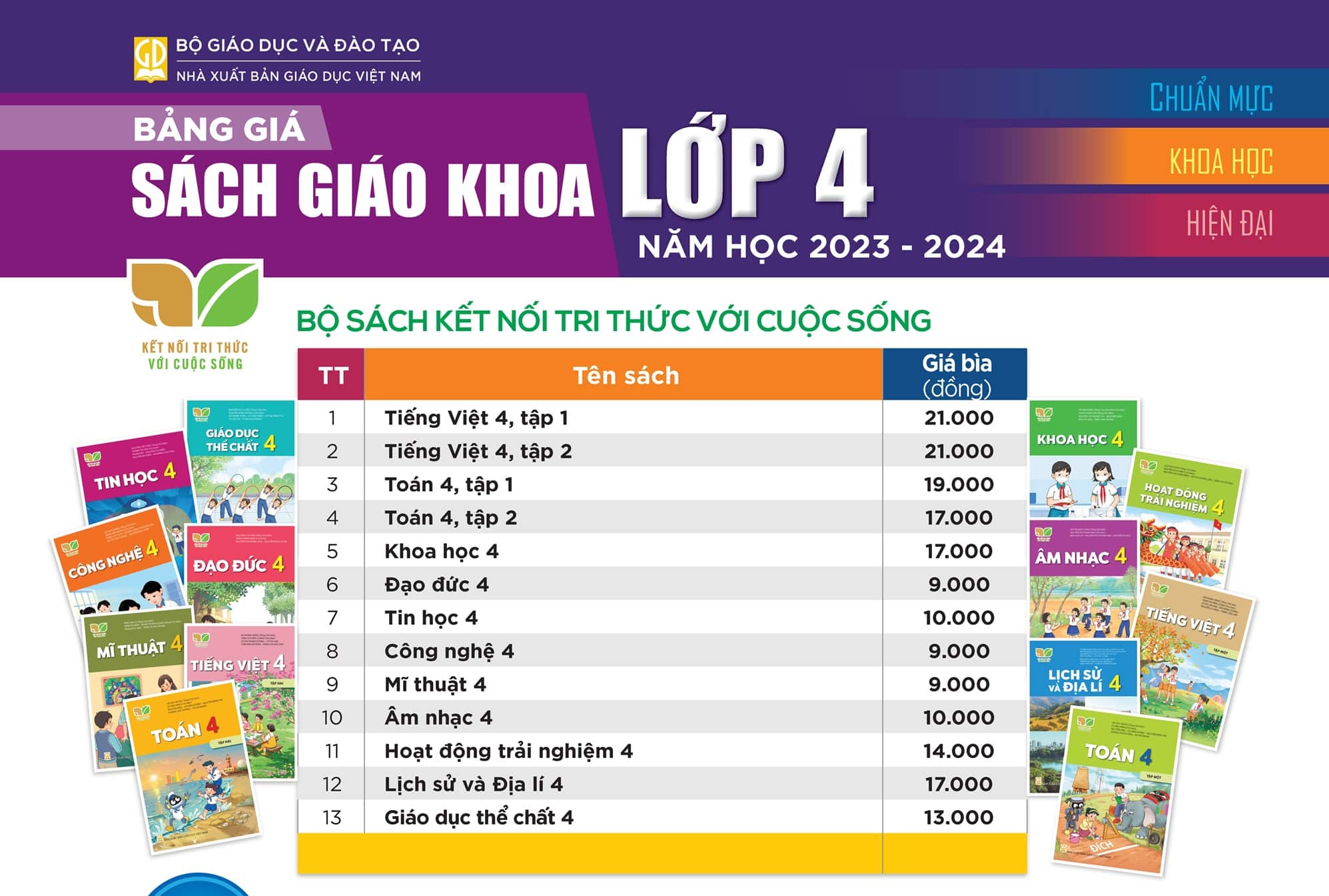 Sách giáo khoa lớp 4 bộ “Kết nối tri thức với cuộc sống” gồm 13 đầu sách, có giá dao động từ 9.000 – 21.000 đồng/cuốn; tổng cộng 186.000 đồng. Bộ “Chân trời sáng tạo” có 15 đầu sách, từ 9.000 – 22.000 đồng/cuốn; tổng giá là 182.000 đồng (chưa bao gồm sách tiếng Anh).