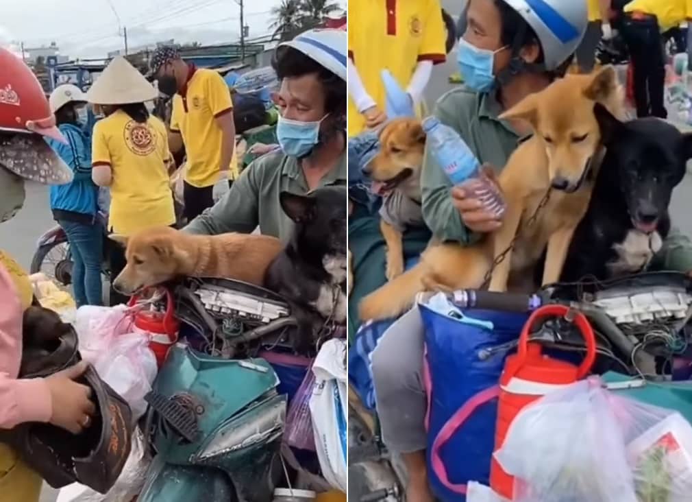 Hai vợ chồng ông Hùng cùng đàn chó dừng nghỉ ven đường. Người trong clip cho hay từ điểm dừng nghỉ này, còn mười mấy tiếng nữa mới về tới Cà Mau. (Ảnh cắt từ clip)