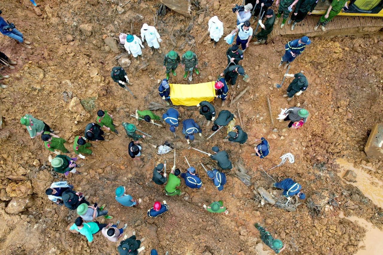 Thi thể của ông T. được tìm thấy ở vị trí nền nhà của gia đình ông, dưới lớp đất sạt lở khoảng hơn 3m. Ngay sau khi tìm được nạn nhân, các lực lượng chức năng tiến hành khử khuẩn, vệ sinh, bàn giao cho gia đình chôn cất theo phong tục địa phương.