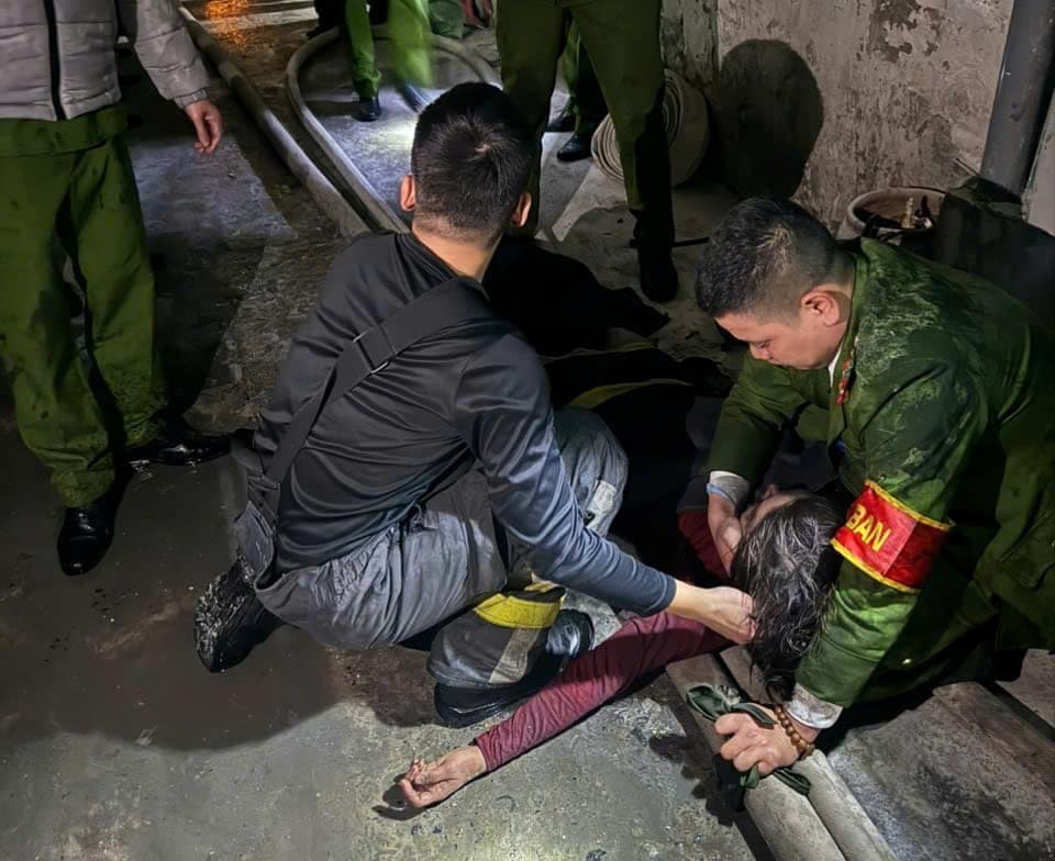 Nạn nhân được cứu khỏi đám cháy. (Ảnh: Công an thành phố Hà Nội/Facebook)