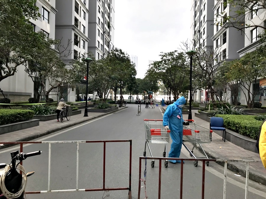 cơ quan chức năng đã dựng rào chắn trên đường vào tòa nhà T6 và sảnh chính để cách ly khu vực này. (Ảnh: CTV/Trí thức VN)