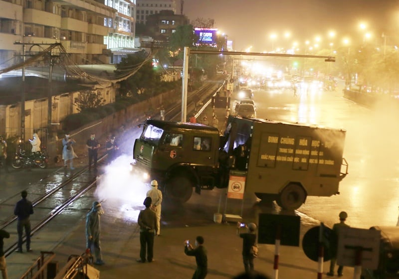 Binh chủng Hóa học thực hiện phun khử khuẩn toàn bộ không gian và tòa nhà trong Bệnh viện Bạch Mai, tối 28/3. (Ảnh: J.N)