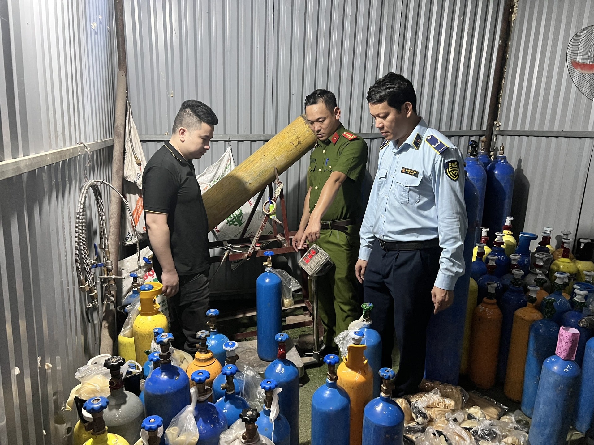 Thời điểm này, công an phát hiện Nguyễn Văn Tính (SN 1992, trú xã Phượng vĩ, huyện Cẩm Khê, tỉnh Phú Thọ), là chủ số hàng trên, đang sử dụng máy để sang chiết các bình khí N2O từ bình loại to 20kg sang các bình loại nhỏ 5kg, 10kg và 15kg. Chủ số hàng này không xuất trình được hóa đơn, chứng từ chứng minh nguồn gốc hợp pháp của số hàng trên.