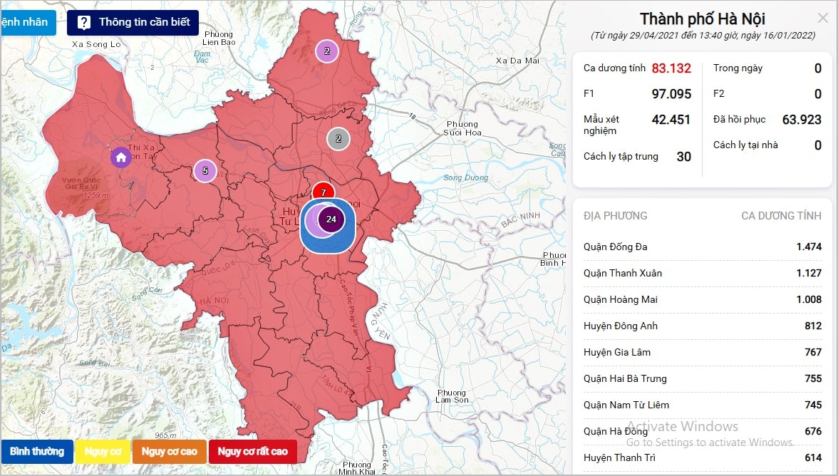 Theo Thông báo 54/TB-UBND do UBND TP Hà Nội ban hành ngày 15/1, cập nhật đến 9 giờ ngày 14/1, Hà Nội thuộc cấp độ 2 (nguy cơ trung bình – vùng vàng). Trong 30 quận/huyện thuộc TP, có 7 quận thuộc cấp độ 3 (nguy cơ cao – vùng cam), 23 quận, huyện còn lại thuộc vùng vàng.