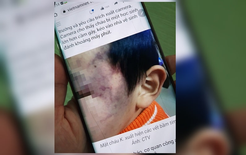 Sự việc sau đó được báo lên hiệu trưởng và bà K. yêu cầu trích xuất camera để tìm hiểu. Hình ảnh ghi lại cho thấy cháu K. bị một bé gái 9 tuổi – con của cô Đ., giáo viên chủ nhiệm lớp mầm non – cầm gậy, kéo vào nhà vệ sinh đánh khoảng mấy phút.