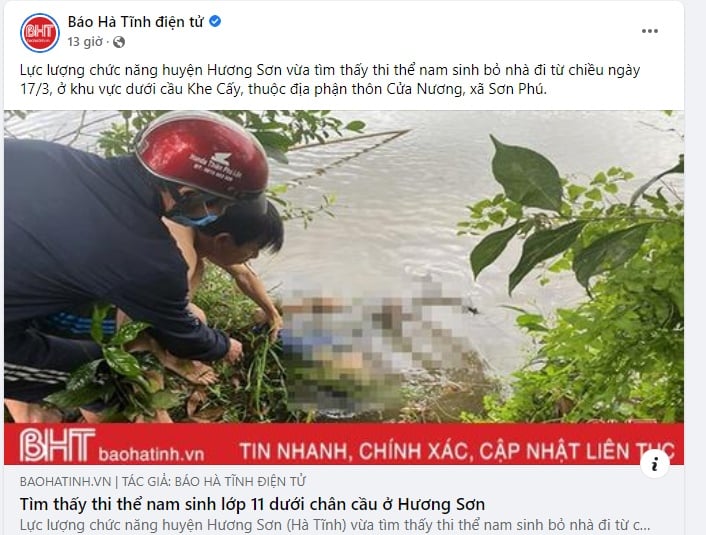 Đến 14h35 cùng ngày, mọi người tìm thấy thi thể em Đ. ở dưới cầu Khe Cấy. Em Đ. đang là học sinh lớp 11 – Trường THPT Hương Sơn.