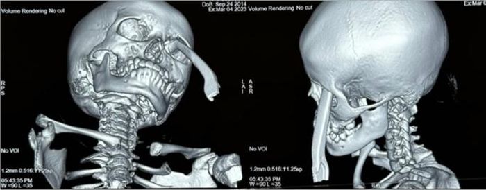 Tại bệnh viện, các bác sĩ đã cho bé thở oxy, truyền dịch, giảm đau, chăm sóc vết thương, tiêm ngừa uốn ván, đánh giá sàng lọc các chấn thương kèm kết quả CT scan sọ não cho thấy có xuất huyết cấp trong nhu mô não, xuất huyết ngoài và dưới màng cứng vùng trán đỉnh trái, vỡ phần mặt ổ mắt của xương trán trái, tụ máu trong xoang hàm trái, dị vật từ bên ngoài vào hốc mắt trái, xuyên hốc mắt trái, xuyên sàn sọ vào nhu mô não.