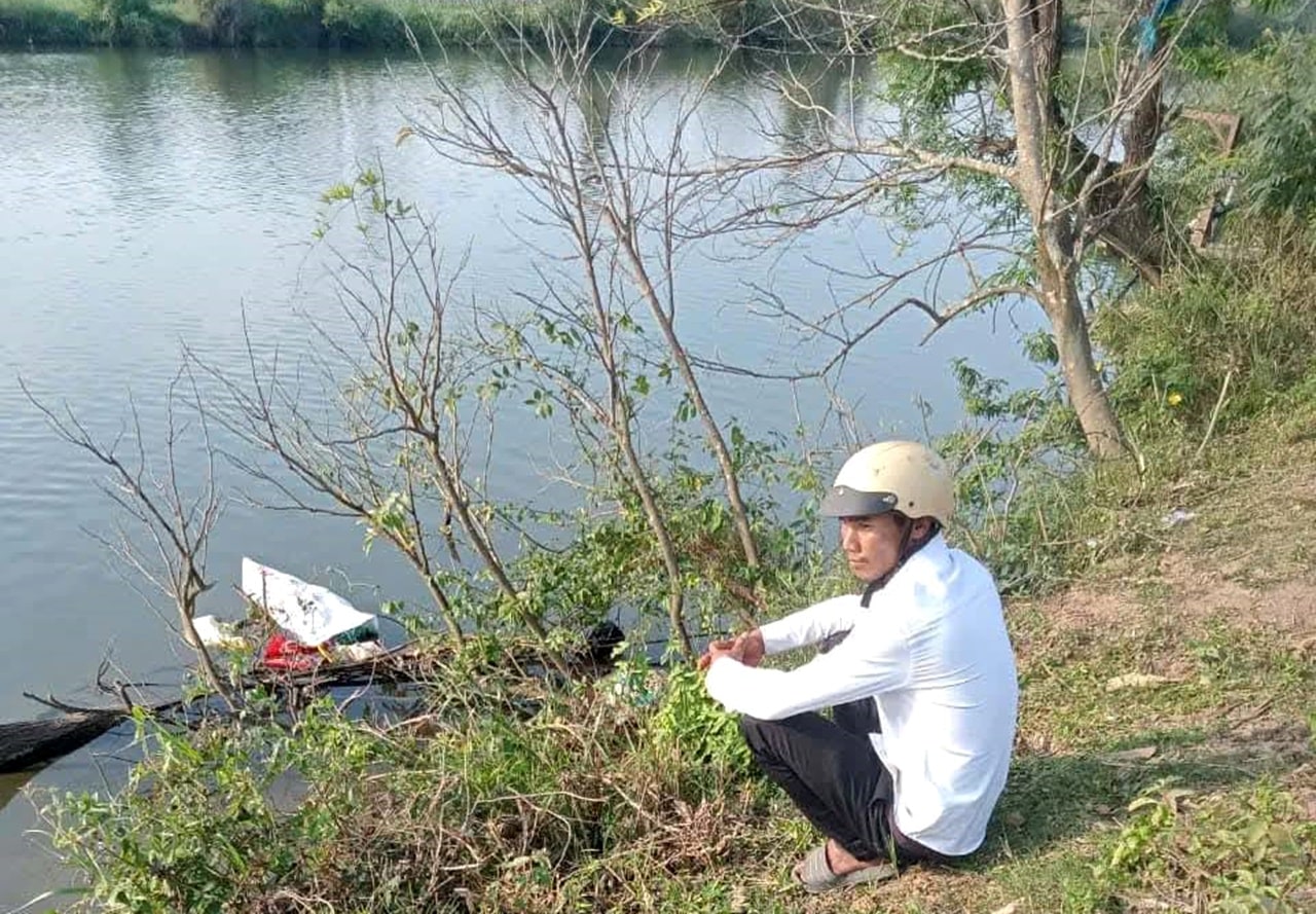 Ông Đinh Bân ngồi bên bờ sông ngóng tin con. (Ảnh: Người dân ghi lại/dẫn qua Nguyễn An/Facebook)
