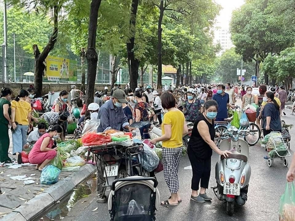 Chợ dân sinh Nguyễn Thị Định (phường Trung Hòa, quận Cầu Giấy, Hà Nội) hỗn loạn, chen chúc trong sáng 24/7 - ngày đầu tiên Hà Nội giãn cách theo Chỉ thị 16. (Ảnh: Người dân cung cấp/Trí thức VN)
