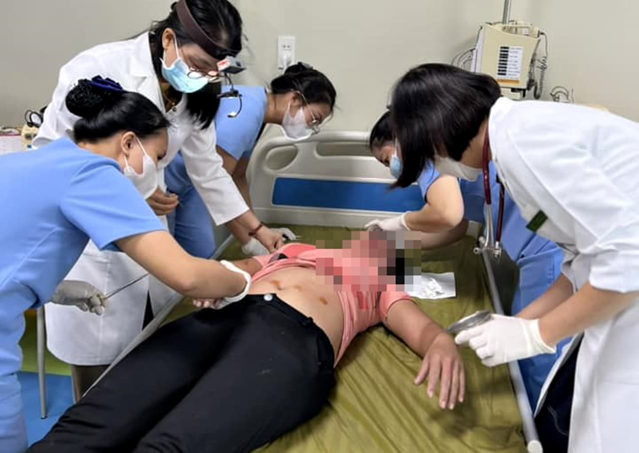 Bác sĩ, y tá cấp cứu cho người phụ nữ bị ong đốt nghiêm trọng, ngày 22/5. (Ảnh: Người dân ghi lại/Facebook)