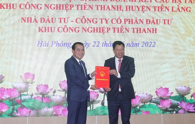 Ban Quản lý Khu kinh tế Hải Phòng hôm 22/6 đã trao giấy chứng nhận đăng ký đầu tư cho dự án Khu công nghiệp Tiên Thanh, huyện Tiên Lãng.