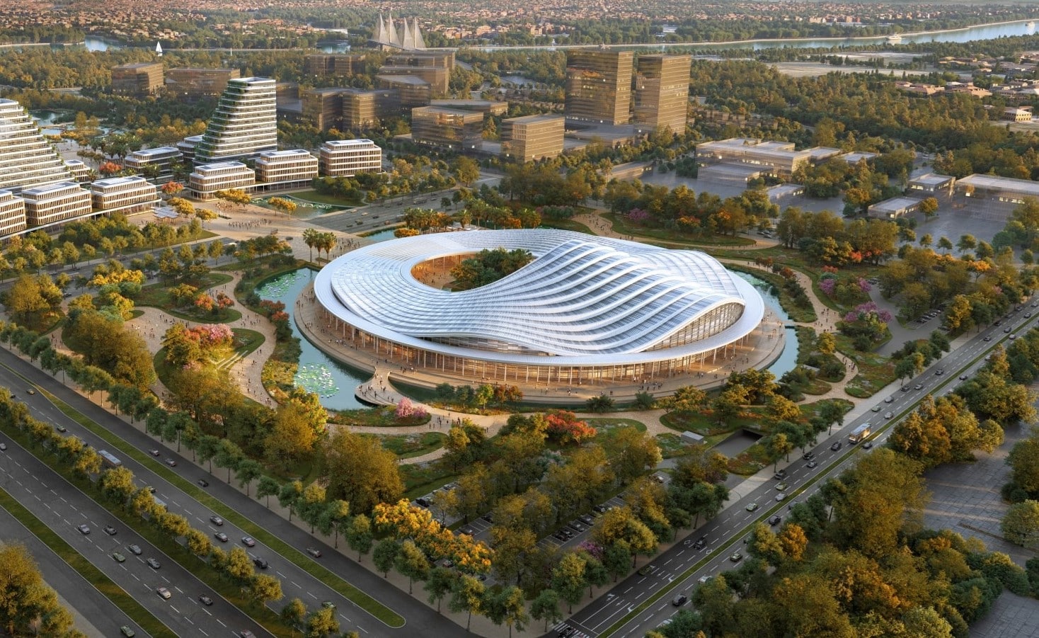 Trung tâm Hội nghị – Biểu diễn thành phố khởi công hôm nay (6/5), nằm tiếp giáp ở phía sau khu Trung tâm Chính trị – Hành chính, được lấy ý tưởng từ hình ảnh của giọt nước rơi xuống mặt nước, tạo ra các làn sóng lan tỏa.