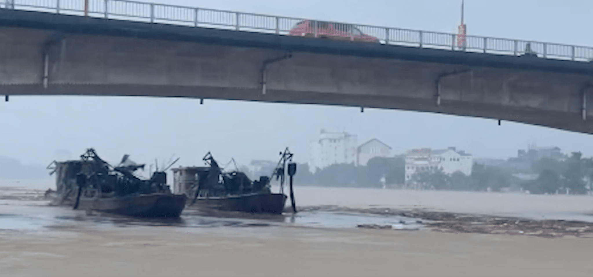 Hai tàu hút cát Trung Quốc trôi dạt trên sông gây nguy cơ mất an toàn. (Ảnh: Chụp mang hình/video)