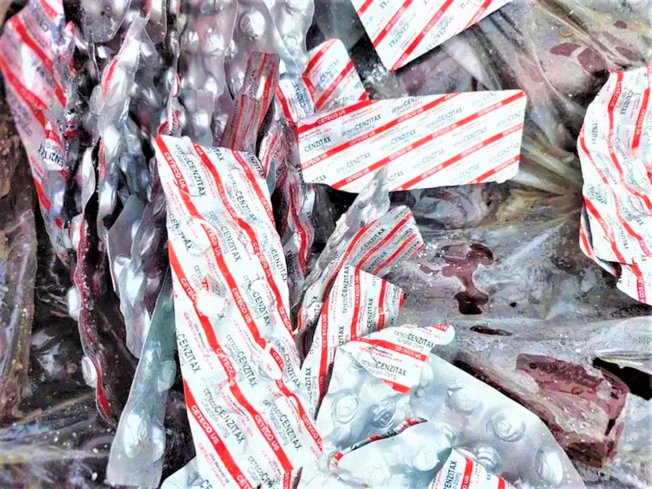 Lực lượng chức năng ghi nhận tại hiện trường ngày 10/6/2025 cho thấy nhiều vỉ thuốc Cetecocenzitax còn nguyên vẹn, hạn sử dụng đến tháng 8/2026, cùng hàng trăm vỏ chai màu nâu không nhãn mác, móp méo, lẫn trong xà bần và rác thải sinh hoạt.