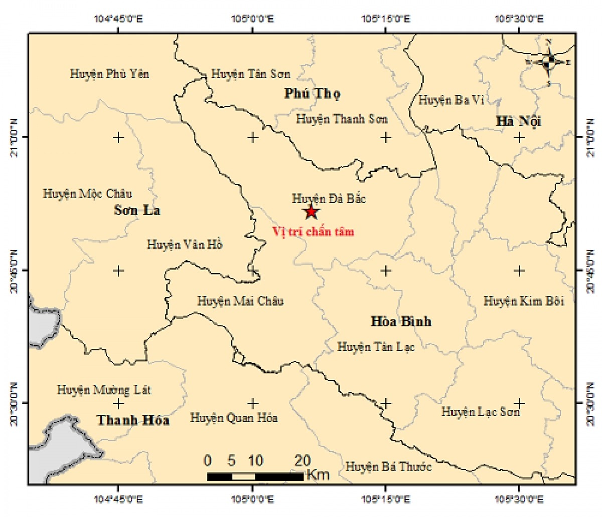 Động đất xảy ra tại khu vực huyện Đà Bắc, tỉnh Hòa Bình, có tọa độ 20.861 độ vĩ Bắc, 105.112 độ kinh Đông.
