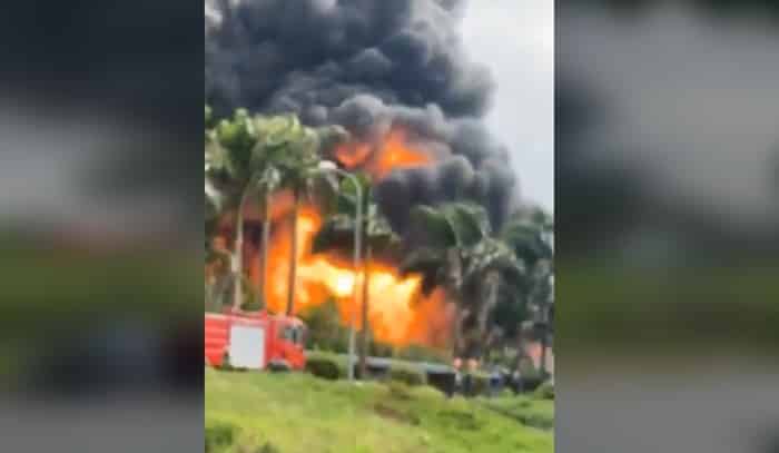 Lửa và cột khói bốc cao dữ dội trong vụ cháy tại kho hoá chất ở cảng Đức Giang (quận Long Biên) vào sáng 30/6/2020. (Ảnh cắt từ clip)