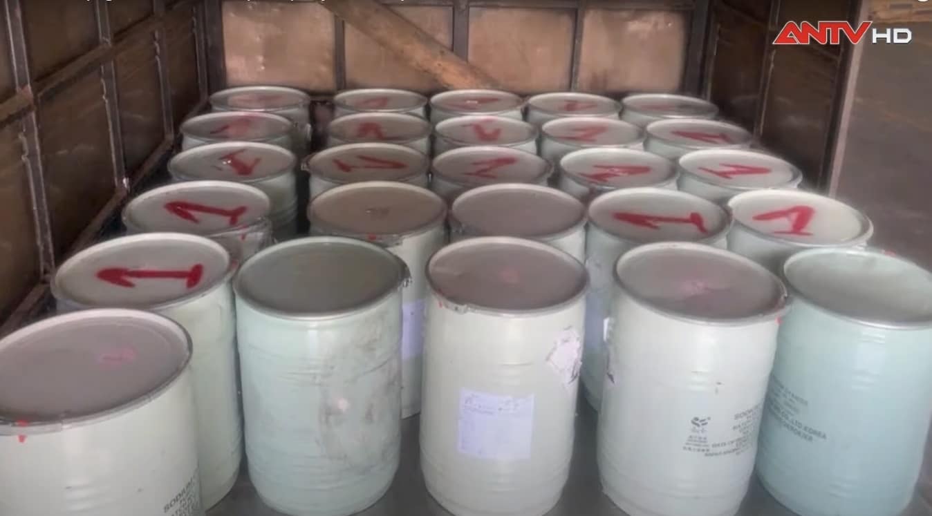 Các thùng xyanua bị phát hiện tại một công ty ở quận 12, TP.HCM, tháng 10/2024. (Ảnh chụp màn hình/ANTV)
