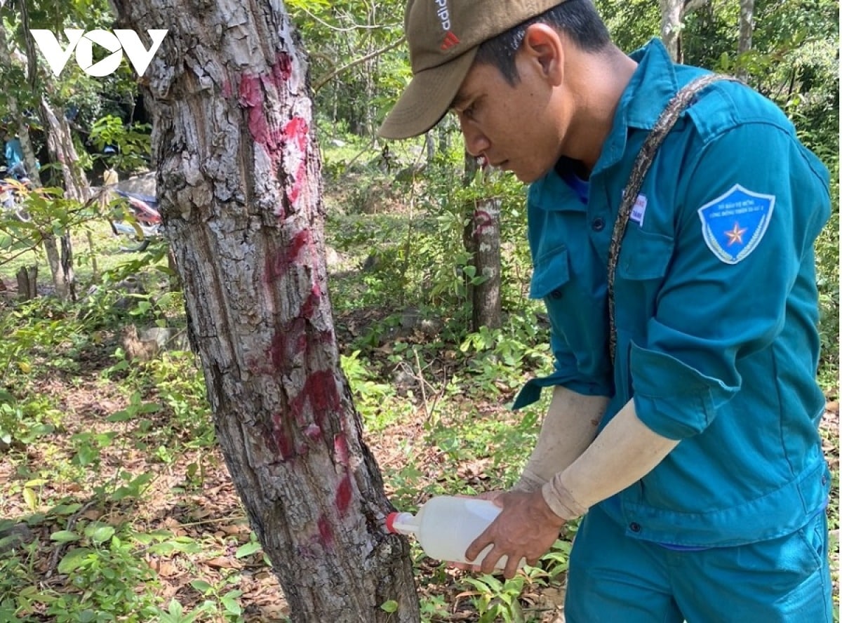 Rà soát, lực lượng chức năng phát hiện hơn 200 cây rừng (đường kính 10-20 cm) chủ yếu là cây Thành ngạnh, Cà nhí, Cứt mọt, Cóc rừng, Mà ma, Sắn ổi, Cà gằng, Căm xe…bị khoan lỗ và đổ hóa chất vào.