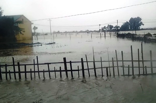 Trưa 5/11, nước lũ đổ về nhanh đã làm vỡ hơn 100 m đê ven biển tại xã Vinh Hải, huyện Phú Lộc, khiến nước biển tràn vào cánh đồng gây ngập úng.