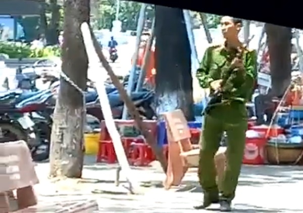 Nghi phạm mặc sắc phục công an, cầm AK nổ nhiều phát súng và tung vàng ra đường trước cổng chợ Đông Ba. (Nguồn: Người dân ghi lại/Thừa Thiên Huế/Facebook)
