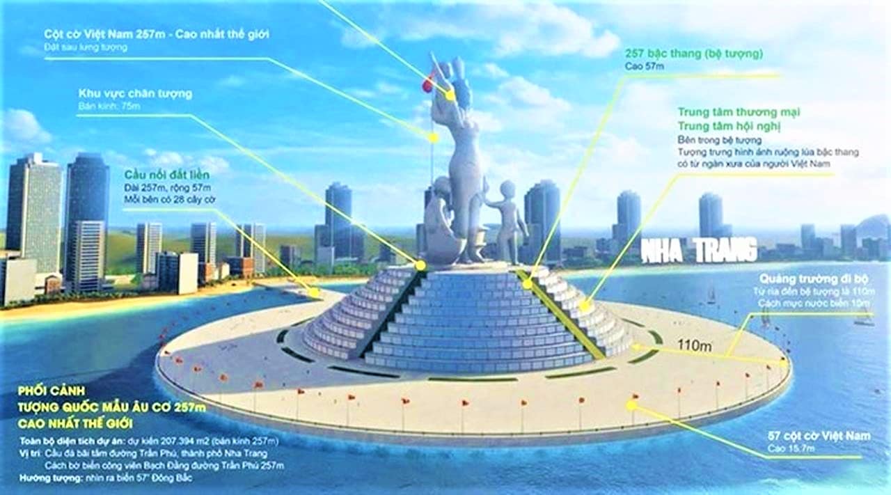 Dự án đề xuất lấp hơn 20 ha mặt biển tại khu vực bãi tắm Cầu Đá, đường Trần Phú, TP. Nha Trang, cách bờ 200-257 m, để xây đảo nổi đặt cụm Tượng Quốc Mẫu Âu Cơ cao 257 m (bệ 57 m, tượng 200 m, cột cờ 200 m), kết nối bằng cầu dẫn từ bãi Cầu Đá.