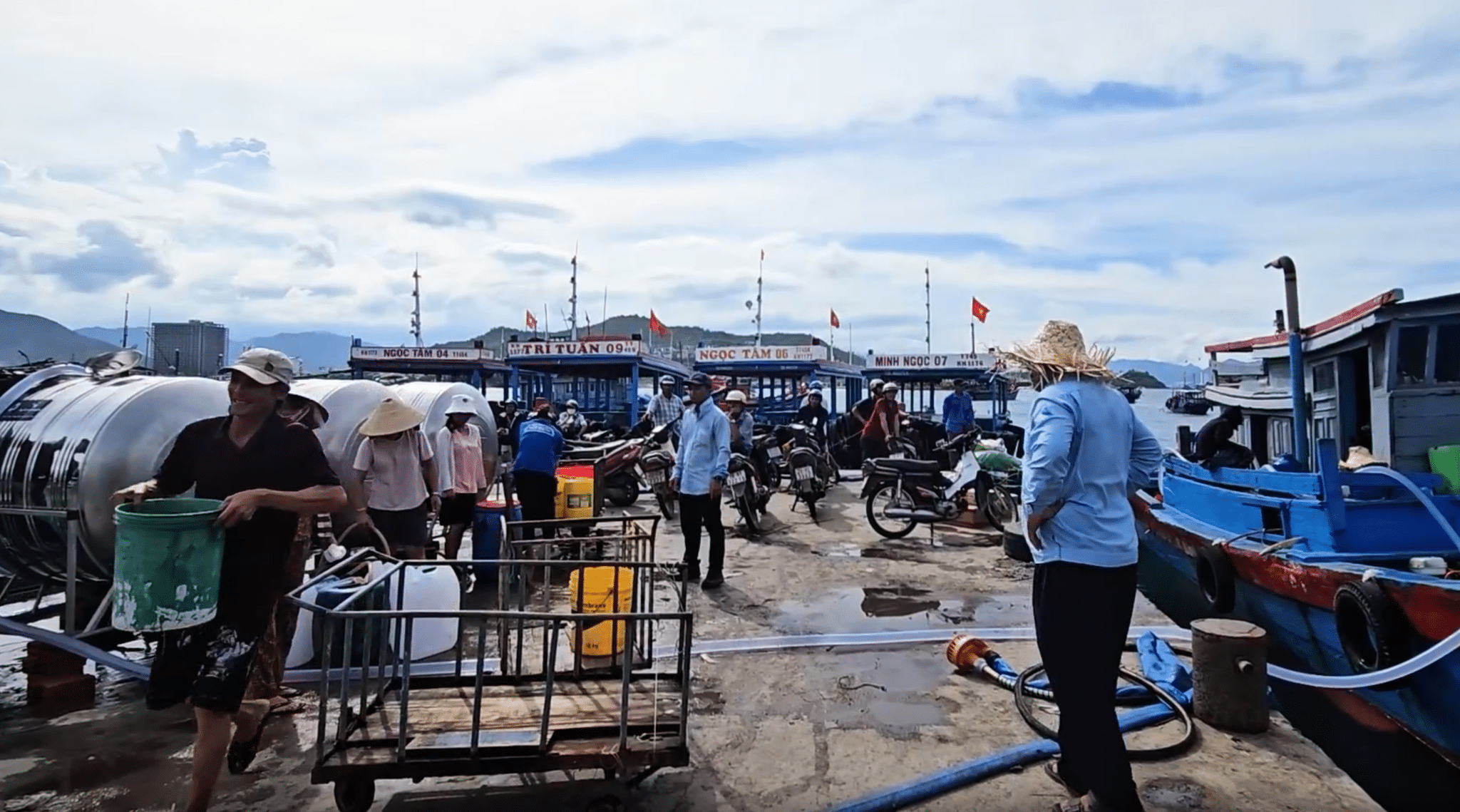 Vỡ đường ống vượt biển, người dân vịnh Nha Trang phải xếp hàng lấy nước ngọt. (Ảnh: Chụp màn hình/video/tuoitre.vn)