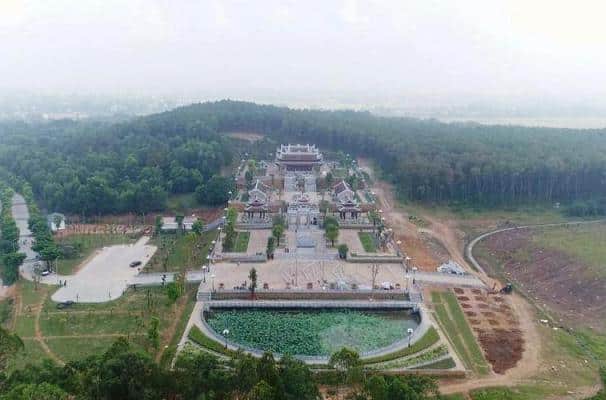 Công trình xây trên diện tích 83ha, khởi công từ năm 2012, với 18 hạng mục gồm: Đền thờ chính, tả hữu vu; nhà chuông, nhà trống; nghi môn nội; nghi môn ngoại, bình phong đá, lầu hóa vàng; san nền; tường kè; cây xanh; cấp thoát nước; cấp điện, chiếu sáng ngoài nhà; chống sét; sân đường, bồn hoa, tường rào; chống mối, nhà vệ sinh; cấp điện chiếu sáng trong nhà; nội thất thờ tự.