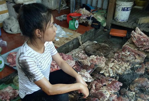 Chị Xuyến cho biết lâu nay chị vốn bán cá tôm tại khu vực chợ này. Vì giá thịt lợn đang xuống thấp, gần đây đàn lợn nhà chị nuôi không có khách mua nên chị đã mổ lợn mang vào nội thành bán được khoảng 10 ngày với hy vọng lấy lại được chút vốn.