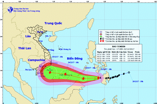 Theo Trung tâm Dự báo Khí tượng Thủy văn Trung ương, hồi 16h ngày 22/12, vị trí tâm bão Tembin ở vào khoảng 7,8 độ Vĩ Bắc; 123,2 độ Kinh Đông, trên khu vực miền Nam Philippines. Sức gió mạnh nhất ở vùng gần tâm bão mạnh cấp 9 (75-90 km/giờ), giật cấp 12.