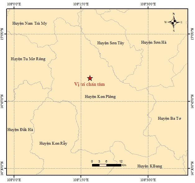 Trận động đất mới nhất xảy ra lúc 10 giờ 4 phút 35 giây sáng nay (4/6) với độ lớn 3,1 độ Richter, có tọa độ (14.832 độ vĩ Bắc, 108.250 độ kinh Đông), độ sâu chấn tiêu khoảng 10 km.