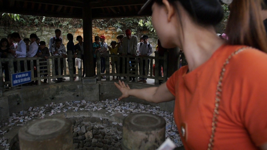 Nhưng bối cảnh dâng lễ vua Hùng hôm ấy nghi ngút khói nhang, những tiếng rì rầm cầu an, mong lộc, những mâm gà luộc, lon bia sấp sới bưng ra bưng vào. Khu hóa vàng, bên những cốc nến đổ vỡ, lửa bùng lên đầy ám ảnh quanh hàng xấp đô la địa phủ người ta tung vào để hóa, để cầu.