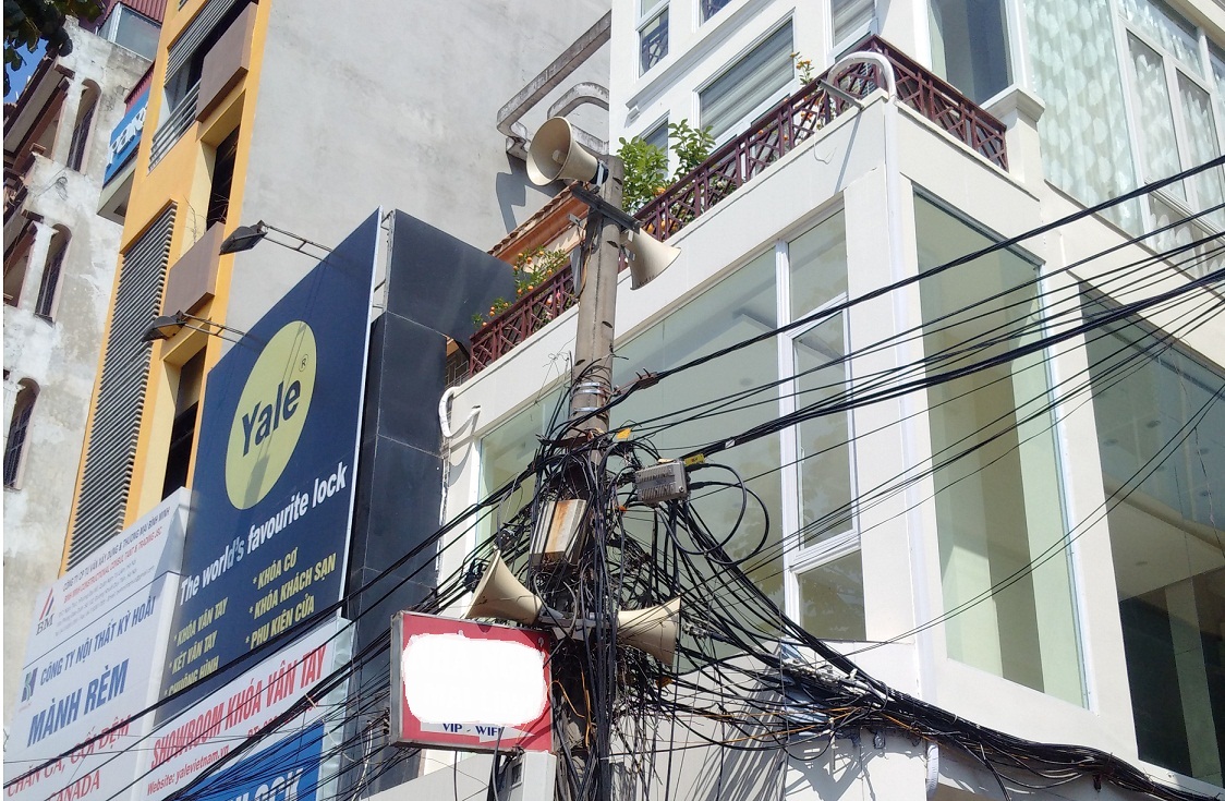 Một cây cột điện được treo tới 4 chiếc loa trên đường Phạm Hùng (Từ Liêm, Hà Nội). (Ảnh: Sơn Trà/TTVN)
