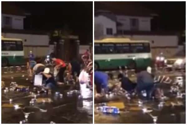 Hình ảnh clip ghi lại cho thấy có hàng chục người tập trung “hôi của” sau sự cố chiếc xe tải làm rơi khoảng 10 thùng bia lon xuống đường.