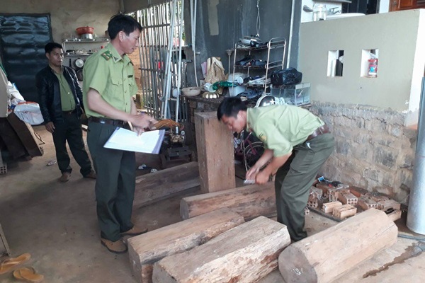 Hạt kiểm lâm Đức Trọng kiểm tra số gỗ thông đỏ tại nhà ông Nhẫn vào ngày 3/8. (Ảnh: baolamdong.vn)