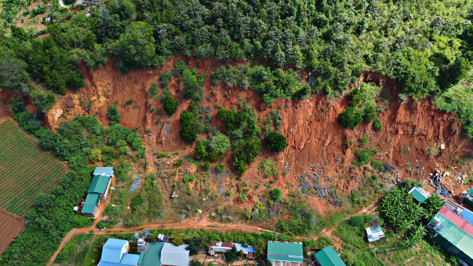 Quả đồi thông, cây tạp rộng 35ha ở thôn Quảng Hiệp (xã Hiệp Thạnh, huyện Đức Trọng, tỉnh Lâm Đồng) nứt toác, có điểm đã tách 2-3m, sụt sâu 3-4m, phần chân đã bị san gạt, sạt lở tạo vách dựng đứng cao khoảng 10m.