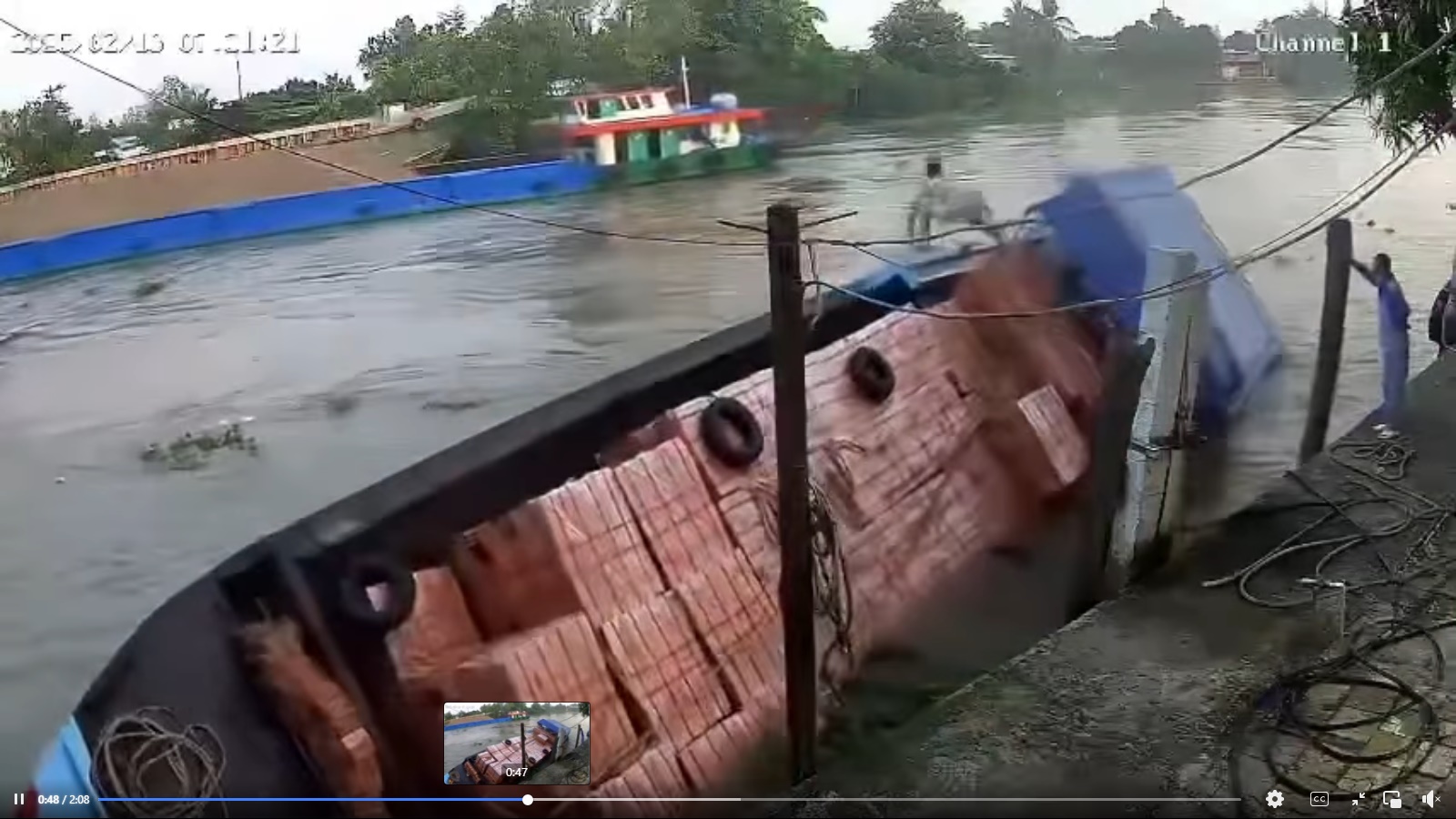 Lan truyền trên mạng xã hội Facebook vào chiều ngày 17/2, video dài 2 phút 08 giây trích xuất từ camera an ninh ghi lại hình ảnh lúc 7h26 ngày 16/2, chiếc ghe chở gạch đang đậu cặp bờ sông thì có hai chiếc sà lan chở cát chạy qua. Sóng đánh làm chiếc ghe chở gạch chồng chềnh, cuối cùng lật nghiêng rồi chìm. Hai người đàn ông trên ghe kịp thoát. Một người trong đó liên tục gọi tìm vợ.
